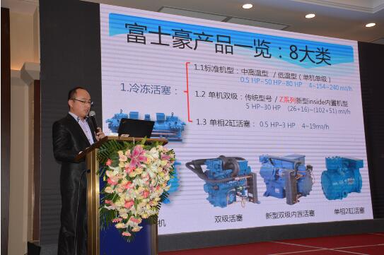 會(huì)議尾聲,由富士豪上海公司的應(yīng)用工程師金偉先生為與會(huì)人員介紹了富士豪的壓縮機(jī)產(chǎn)品系列、在不同領(lǐng)域的應(yīng)用,以及新的技術(shù)解決方案。金偉先生強(qiáng)調(diào)在富士豪的冷凍螺桿壓縮機(jī)里,低溫型最小的匹數(shù)有30HP,最大的匹數(shù)可達(dá)125HP,160HP。而在活塞機(jī)的介紹中,金偉先生提到富士豪活塞機(jī)的命名全部是匹數(shù)與排量的結(jié)合,既可用于R404,又可用于R22的制冷劑。在低溫機(jī)與高溫機(jī)的對(duì)比下,同樣的排量下,電機(jī)小的代表低溫型,電機(jī)大的代表中高溫型。而對(duì)于活塞機(jī)的接線(xiàn)和接管方式,金偉先生也做了比較詳盡地介紹。同時(shí),富士豪也逐漸開(kāi)始將已在歐洲市場(chǎng)運(yùn)用成熟的二氧化碳?jí)嚎s機(jī)應(yīng)用于中國(guó)市場(chǎng),尤其是熱泵領(lǐng)域的應(yīng)用等。