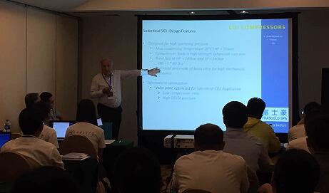 在7月22日上午的分會(huì)場(chǎng)報(bào)告中,富士豪中國(guó)區(qū)總經(jīng)理伊萬(wàn)先生以“富士豪二氧化碳?jí)嚎s機(jī)產(chǎn)品范圍”為主題,向來(lái)賓詳細(xì)介紹了富士豪跨臨界二氧化碳?jí)嚎s機(jī)和亞臨界二氧化碳?jí)嚎s機(jī)的產(chǎn)品范圍和技術(shù)特色。富士豪在二氧化碳?jí)嚎s機(jī)生產(chǎn)和應(yīng)用方面已有將近10年的歷史,產(chǎn)品種類齊全,型號(hào)眾多,主要有二氧化碳跨臨界TK系列和亞臨界SK系列,廣泛應(yīng)用于各個(gè)制冷行業(yè)和領(lǐng)域。會(huì)后,伊萬(wàn)先生在接受采訪時(shí)提到:富士豪中國(guó)可以給客戶在壓縮機(jī)和系統(tǒng)設(shè)計(jì)方面提供咨詢和幫助,對(duì)希望利用新型科技生態(tài)冷媒的客戶提供技術(shù)支持與人員培訓(xùn)。富士豪意大利一直致力于為世界各地生產(chǎn)制造制冷壓縮機(jī),對(duì)于在歐洲市場(chǎng)上使用環(huán)保冷媒的經(jīng)驗(yàn),富士豪也樂(lè)于分享。