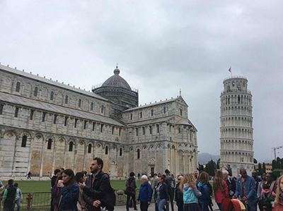 來(lái)到奇跡廣場(chǎng),迅速被一組散落在草坪上的白色建筑所吸引。建造于1063年-13世紀(jì)的大教堂、建造于1153年-14世紀(jì)的洗禮堂、以及舉世聞名的比薩斜塔和建造于1174年的墓園。由統(tǒng)一的乳白色大理石砌成的外墻面,各自相對(duì)獨(dú)立但又形成統(tǒng)一羅馬式建筑風(fēng)格。大教堂、洗禮堂和鐘樓之間形成了視覺(jué)上的連續(xù)性。再往里走就看到了比薩斜塔,周?chē)莵?lái)自世界各地的游客通過(guò)各種奇思妙想,通過(guò)瘋狂擺出各種不同pose來(lái)防止比薩斜塔繼續(xù)傾斜。這座高58.36米的斜塔于1174年首次發(fā)現(xiàn)傾斜,但是對(duì)于斜塔傾斜的原因最初的一段時(shí)間人們認(rèn)為是建筑師有意為之,也是在后來(lái)人們才發(fā)現(xiàn),比薩斜塔之所以會(huì)傾斜,是由于它地基下面土層的特殊性造成的。1987年4月,國(guó)際古跡遺產(chǎn)理事會(huì)提名意大利比薩城的奇跡廣場(chǎng)(包括大教堂、洗禮堂、比薩斜塔和墓園)為世界遺產(chǎn)。