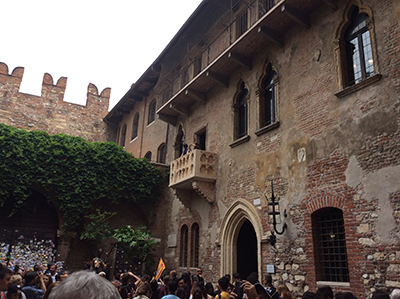 跟著導(dǎo)游來(lái)到朱麗葉的故鄉(xiāng)------維羅納,羅密歐在朱麗葉家的陽(yáng)臺(tái)向朱麗葉求愛(ài)的情形仿佛又在我們眼前上演。通道兩邊故居墻上布滿了世界各地游客對(duì)于愛(ài)情誓言的涂鴉,密密麻麻的愛(ài)情鎖不知道鎖住了多少少男少女的愛(ài)情故事和心愿。陽(yáng)臺(tái)下那座朱麗葉的銅像也因?yàn)閭髡f(shuō)右胸會(huì)帶來(lái)好運(yùn)而被游客撫摸的錚錚發(fā)亮。希望全天下的有情人都可以終成眷屬!因?yàn)閻?ài)情可以戰(zhàn)勝一切!